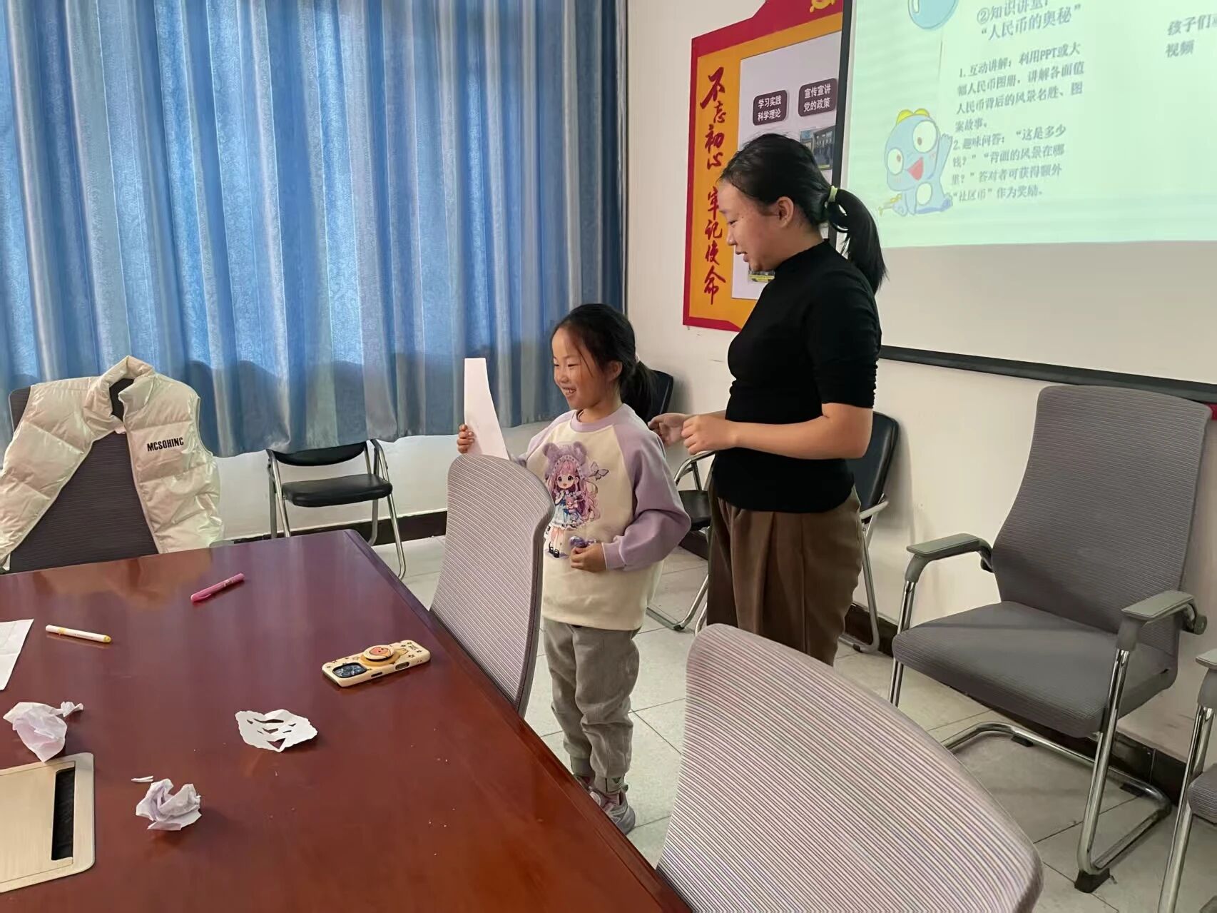 在“人民币的奥秘”知识讲堂上,社工通过PPT和人民币图册,生动讲解了各面值人民币背后的风景名胜与图案故事。趣味问答环节中,孩子们踊跃举手抢答,“50元背面是布达拉宫”的响亮回答不绝于耳,答对的小朋友还收获了“贴纸”奖励,小脸上写满了自豪,就连平时腼腆的孩子也忍不住跟着小声念叨答案,现场氛围十分热烈。随后的“迷你银行”情景游戏中,孩子们聚精会神地观看存钱、取钱的流程视频,时不时还和身边的小伙伴交流:“原来存钱还要填单子呀!”“取钱的时候要带身份证呢!”一个个小脑袋凑在一起,把银行的基础业务流程记在了心里。
