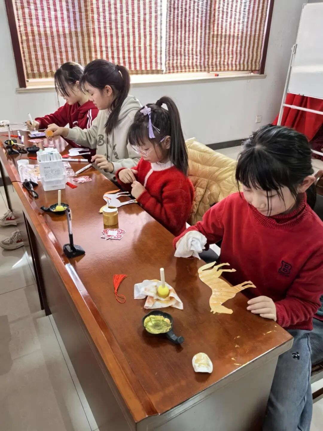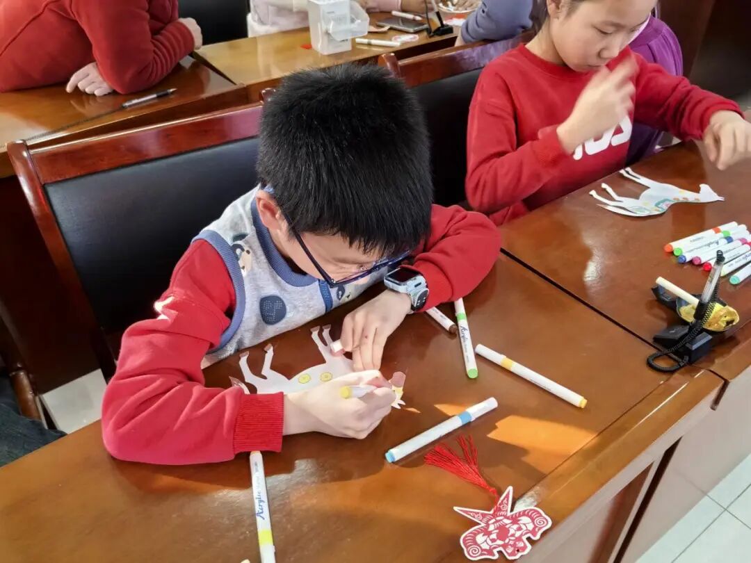 活动最后,迎来了孩子们最期待的手工创作环节。社工为每个孩子分发了空白纸质小马、彩色画笔、闪粉、亮片等材料,邀请大家发挥想象力,创作属于自己独一无二的小马。拿到材料后,孩子们立刻投入创作,有的孩子用红色画笔给小马涂上喜庆的新年装,有的用亮粉装饰小马的鬃毛,还有的在小马旁边画上灯笼、鞭炮等春节元素,赋予作品满满的新春氛围。两位社工穿梭在孩子们中间,耐心指导动手能力较弱的孩子,及时提供帮助,并不断夸赞孩子们的创意。经过半个多小时的创作,一个个色彩鲜艳、充满童趣的手工小马陆续完成,孩子们举着自己的作品互相展示,脸上洋溢着幸福和成就感。